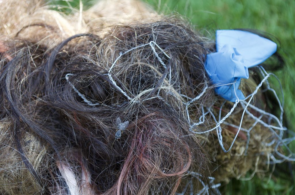 Remnants 4, 2020, Knitted human hair, pink flagging string, mannequin legs, newspaper, acrylic sealer, acrylic paint, aluminum dryer hose, nylon face mask, used nitrile examination gloves, wheel trolley, 24″ x 60″ x 24″