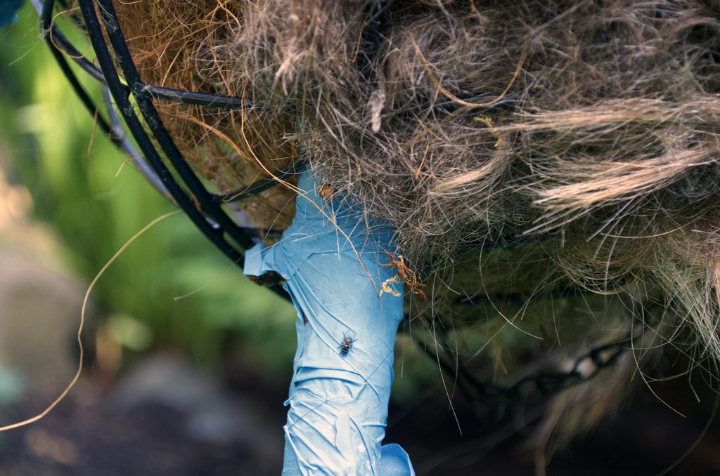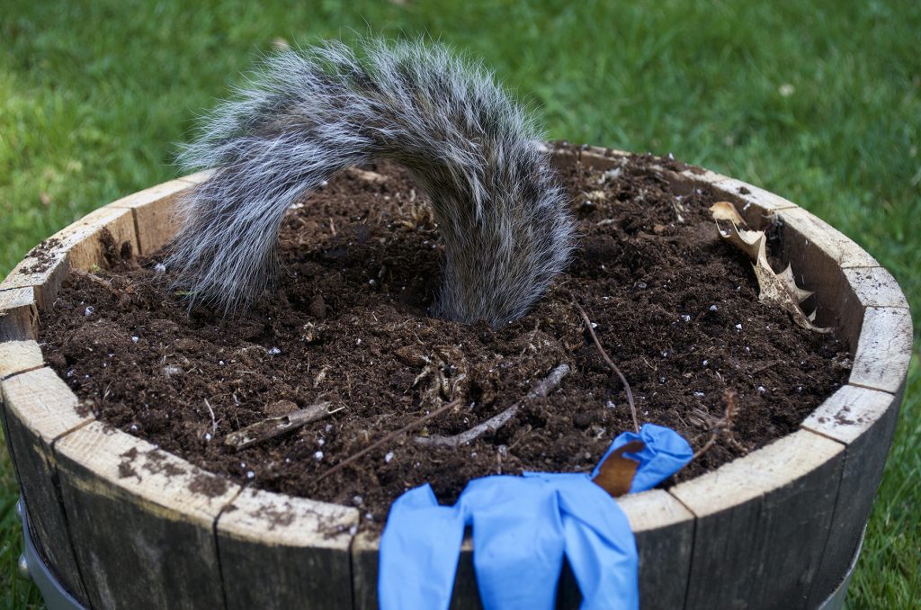 Remnants 1, 2020 Potting soil, oak planter (formerly a sherry barrel with metal hoops ), used nitrile examination gloves, squirrel tail, human hair, 15″ x15″ x9”