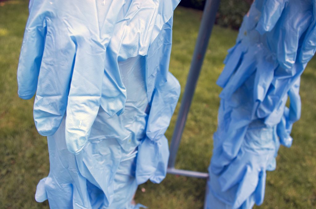 Image above: Remnants 5, from Pandemic Sculpture Garden series, 2020 Mirror, mannequin hand, used nitrile examination glove, false nails, squirrel hair, 36.5″ X 32″ X 4”
